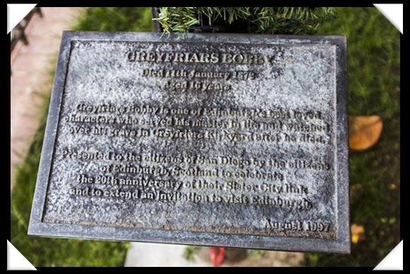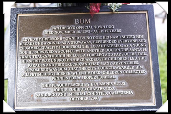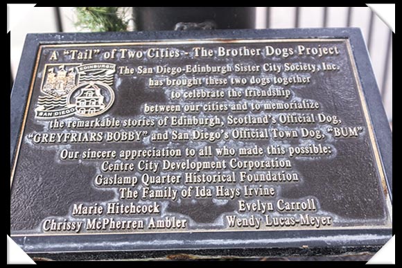 I walked around the park and found some fascinating information about “The Brother Dogs Project” a “tail” of two cities and two dogs—Greyfriars Bobby, the official dog of Edinburgh, Scotland, and San Diego’s Official Town Dog, Bum.