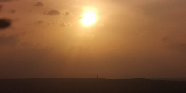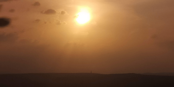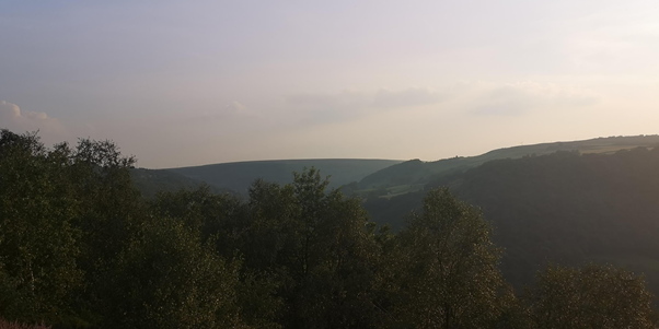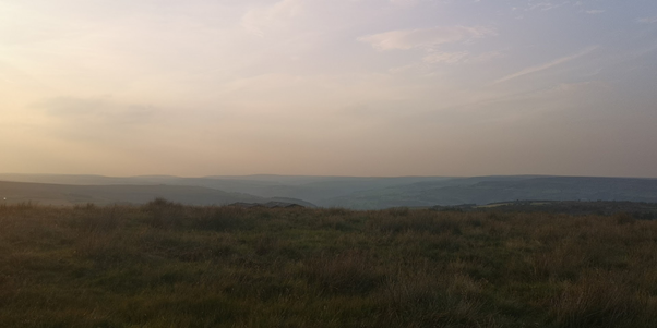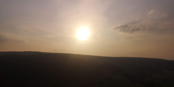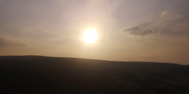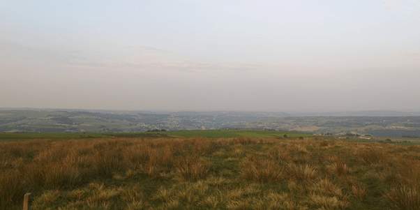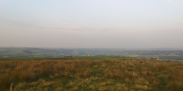 We run towards Scout Woods some of it on the Hebden 22 route and carried on up trails and paths I had never been on. The views were stunning, they always are in the Calder Valley, but tonight even more so. The heat produced a simmering haze on the horizon and the land and the sky became one in a magical, other worldly line. We carried on up over Coppy Nook Lane and High Stones Road and we could see Crow Hill in front of us. It was a short climb reminiscent of the climb up to Shackleton Knoll and soon we were at the trig point. We stopped to take in the views. Words and photos cannot do what I saw justice. Everywhere was bathed in glorious, evening sunshine, Stoodley Pike looked magnificent on the horizon standing proud and majestic against the backdrop of moors and fells relaxing in the heat. I took some photos and we set off back down towards Cragg Vale Road on the Calderdale Way.