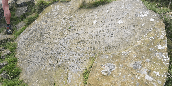 We ran up Nab Rough and I showed Claire the Stanza Stone at one of the four best views in the whole of Yorkshire as decided by the Dalesman. Except I didn’t. I ran up and went to the wrong cairn and got confused and disorientated which worried me and made me glad I was up here with Claire. Claire found it and I was back on the route. Here we stopped and looked at the stone me noticing for the first time the initials of Simon Armitage in the corner and taking a photo of Claire sitting above it.