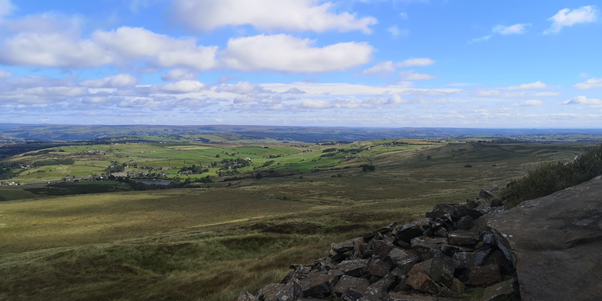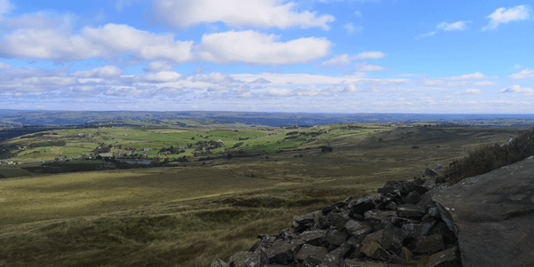 We made it to the top of the first hill despite Claire taking a slightly wrong route and me trusting her sense of direction. I’m as bad as I would prove later on. Over the road, past the farmhouse, over the stile and down the field to Lee Lane and past Leeshaw reservoir. We passed three lasses also doing a recce we had seen early on at the car. We said ‘hi’ well Claire did, and left them to their run. We ran past Leeshaw and then walked up Bodkin Lane and Stairs Lane. This bit is steep and energy sapping so I always find it sensible to walk this bit and save my energy for later in the race. At the conduit on Stairs Lane we turned left and ran beside it. This part is slightly uphill but offers a chance to get your breath back and see what pace you have. The views here are spectacular on a day like today. taking in the three peaks as well as the moors. We carried on the conduit and Claire was quiet at this point which worried me a little bit. Because I don’t pick up on body language and facial expressions very well I don’t always know if people are quiet because they’re happy or because of me so I always assume it’s me. I asked Claire and she said she was in a meditative state which put me at ease and we carried on our way.