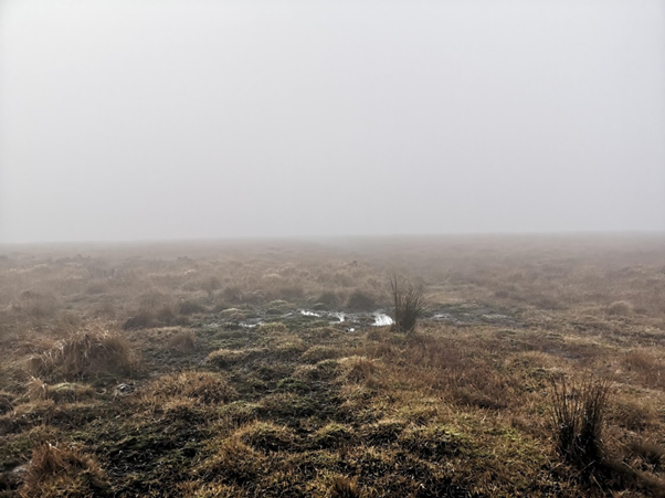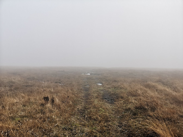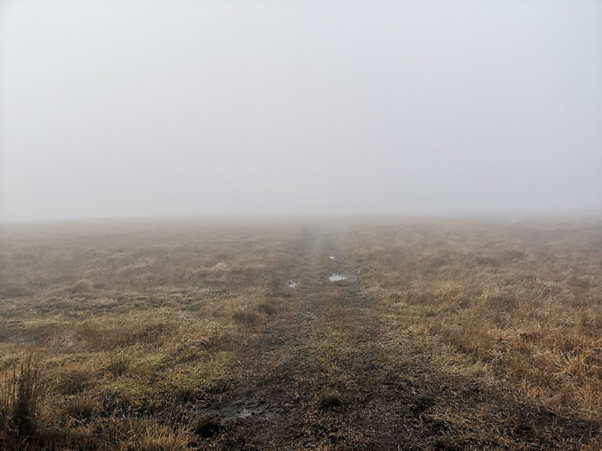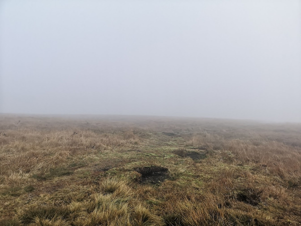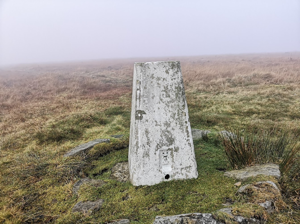 At the top I started running, following the trail a trail that bared to the right until I realised that I was going away from the trig point and I turned round and found a path that took me to the trig point. I got to the trig point, feet covered in mud, cold and wet but feeling good. Good to be back at one of my favourite spots in Calderdale even if the views were non-existent due to being enveloped in a shroud of mist that took everything away, sights, sounds, smells, all signs of any existence.