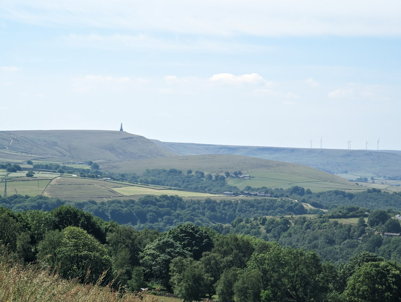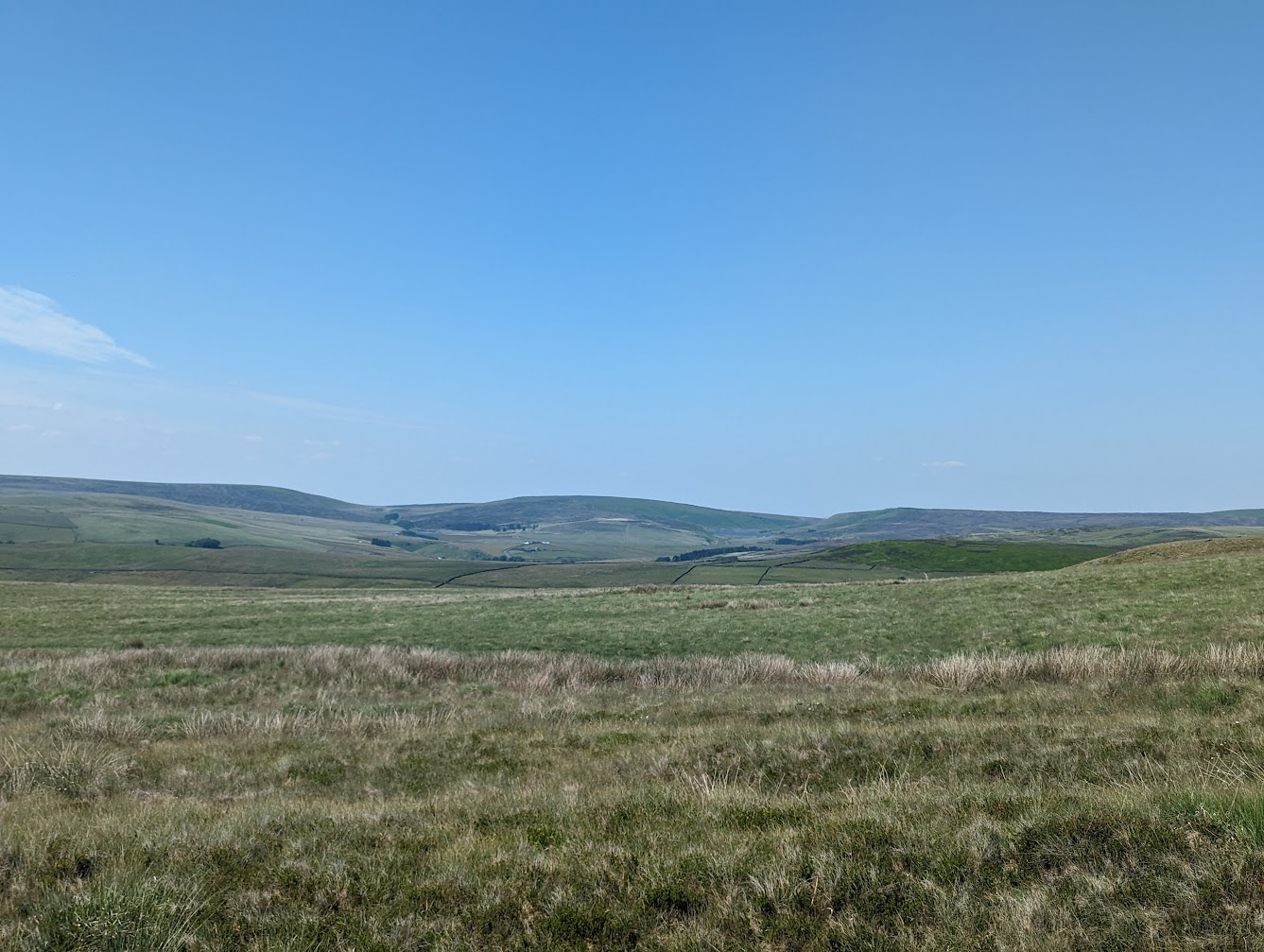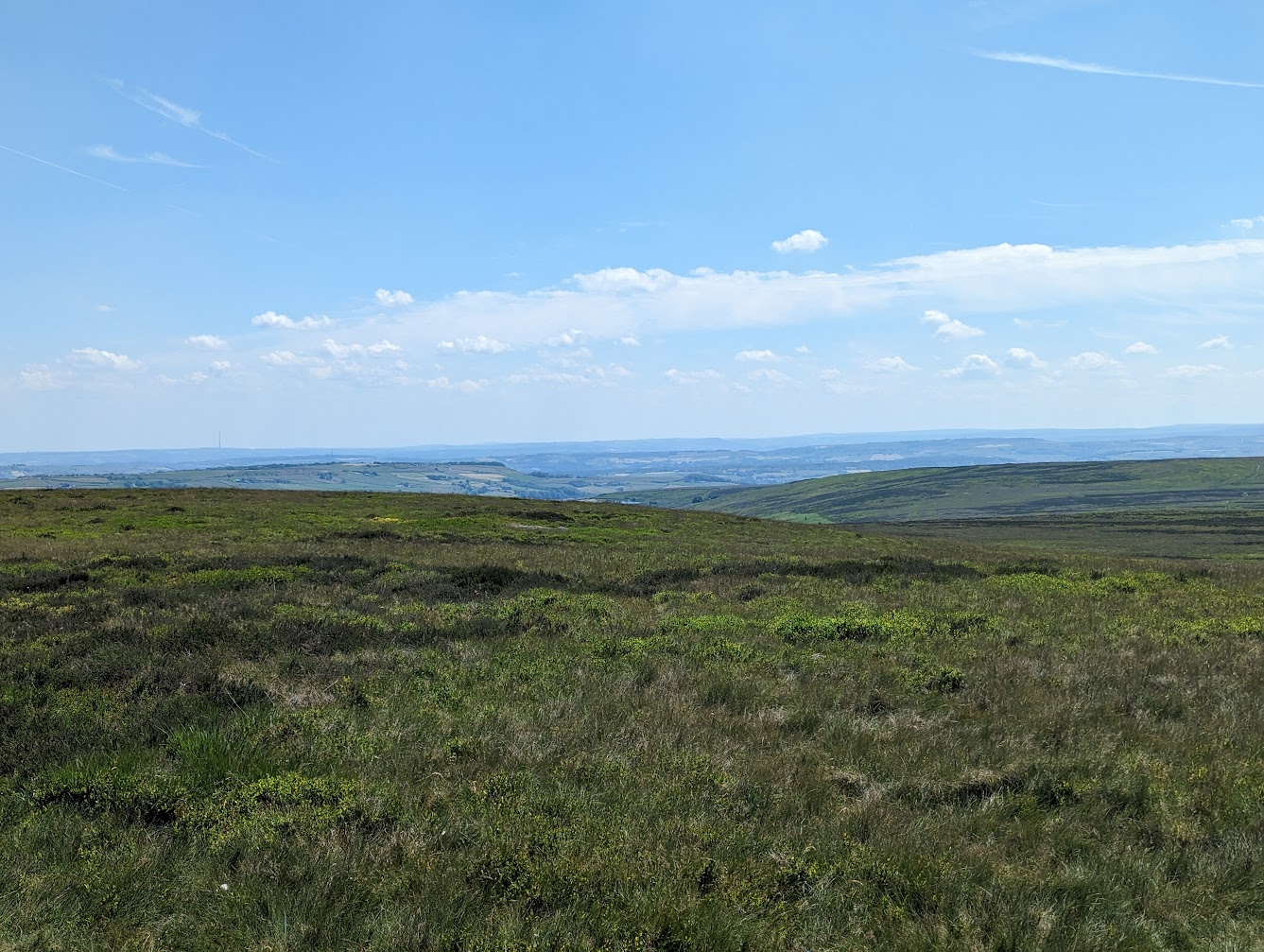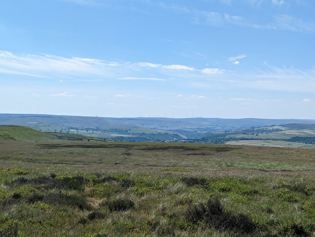 I was in a really good mood because of my good news, and I decided to go for a run over the moors above Hebden Bridge to celebrate. I can’t run far because of my hip, so I’m putting all the knowledge I’ve built of the area to good use and creating runs of around 4 miles that still have interesting routes and go to a good vantage point. Today I decided to go to High Brown Knoll on top of Midgley Moor. I parked up at Old Town cricket club and jogged up Wainsgate Lane and Slack House Lane to the moor. At the moor I followed a path I have run on before along the edge of the moor until it disappeared! One minute I was on a trail, then following a trod and then nothing, at which point I decided it would be better to head up the moor and get on the trail above me, rather then keep heading across open moorland which would add a lot of time to my run. I did stop in the middle of the open moorland and take some photos while thinking about someone who has recently passed away and was an avid photographer at fell races everywhere. The views were so beautiful and so far reaching. It was a privilege to be able to witness them on such a stunning day.