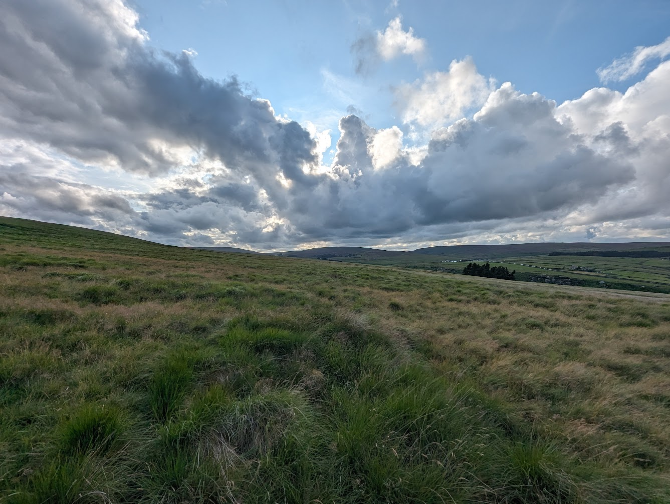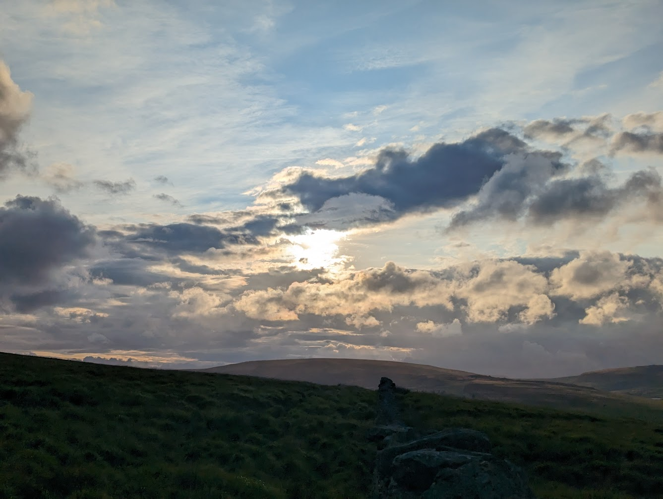 Wednesday was the day of the Widdop fell race, one of the races Calder Valley put on. I was down to marshal at a point just below Standing Stone Hill on Heptonstall Moor. It was a bit of climb up to my post but there were such stunning views everywhere the effort to get there was more than worth it. I’d forgotten how much I love this part of the world, within my beloved Yorkshire, so close to the border with Lancashire, yet it could be a part of neither, a county on its own, a part of the world so beautiful it doesn’t need a county just a place to rest its hills, tussocks and bracken and see who discovers its beauty and who goes past without giving it a second look. I have experienced its beauty before in wind, rain, snow and sunshine and tonight I experienced the most stunning setting sun, bathing the valley below me in golden flames of light, revealing a new beauty I had not seen before.